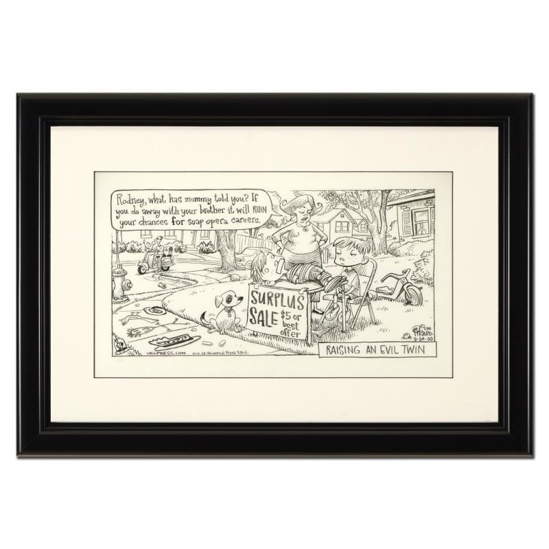 Enter a surreal and satirical world of twisted imagination and award winning creativity. "Raising an Evil Twin" is an original pen & ink drawing on paper by Dan Piraro, creator of the critically acclaimed and award winning comic strip, Bizarro. This piece is hand signed and comes framed. Includes Letter of Authenticity! Measures approx. 20.5" x 14.5" (frame), 13" x 7" (image).