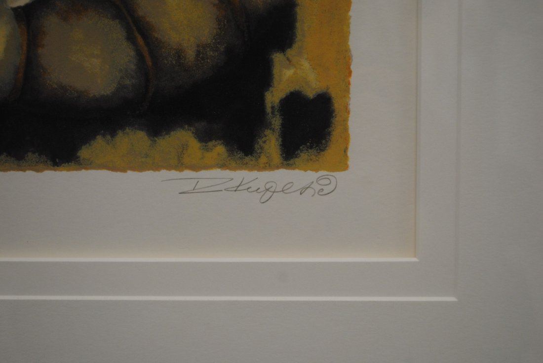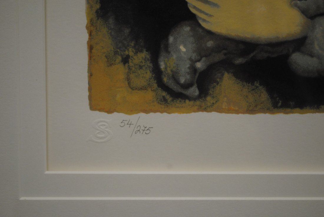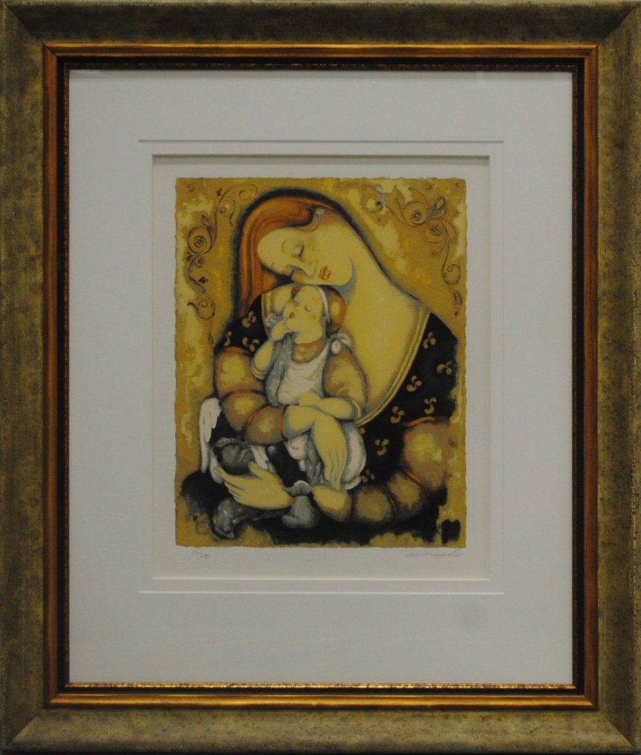Raja Kupesie's "Madonna" limited edition print signed and numbered 54/275. This has been professionally double matted using acid free matting, and acid free foam core, and has custom framed under glass with a inner frame liner. Image- 17" x 13 1/2". Frame- 34 1/2" x 29 1/4".