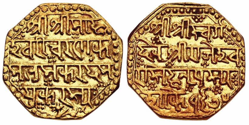 Rajesvara Simha, Octagonal Gold Mohur, 11.35g, SE 1675 (AD 1753), Obverse: Sri Sri Hara/ Gauri Charana Ka/mala Makaranda / Madhukarasya with a lion below to left, Reverse: Sri Sri Svarga/deva Sri Rajesva/ra Simha Nripasya/Sake 1675, legend in Devanagari (Rhodes & Bose O81.1; KM 150; Friedberg 942). Extremely Fine, Very Rare.