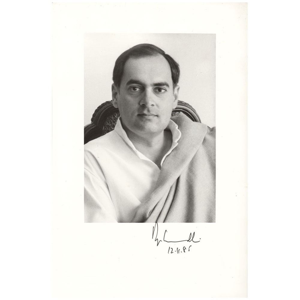 Semi-glossy 6 x 9 photo of the Indian prime minister, signed in the lower border in black felt tip, "Rajiv Gandhi, 12.11.85." In very good to fine condition, with scattered creases, primarily to the borders. Accompanied by the original transmittal letter from his office.