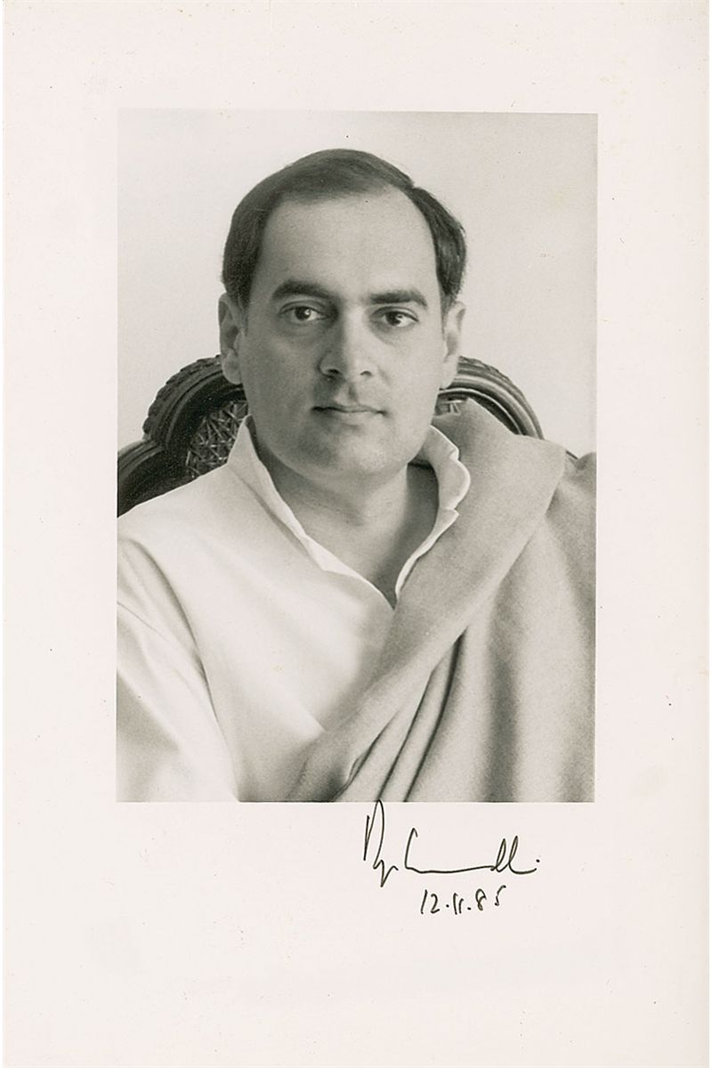 Former prime minister of India, son of Indira Gandhi and grandson of Nehru. He was assassinated in 1991 during an election campaign. Pearl-finish 6 x 9 photo, signed in the lower border in black ink, “Rajiv Gandhi 12.11.85.” Some scattered bends, creases, and surface marks, otherwise fine condition. Accompanied by a 1985 letter from the prime minister’s office acknowledging the photo.
