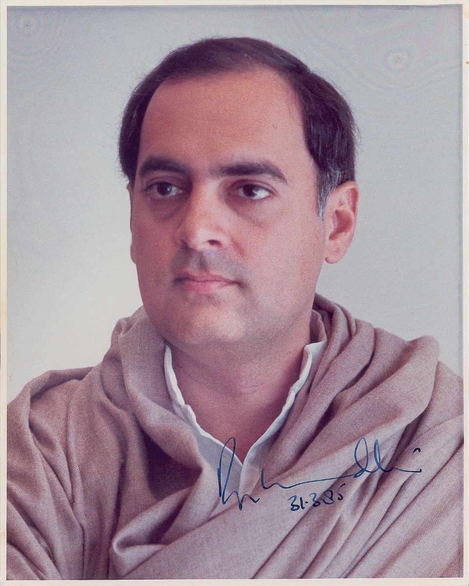 Color glossy 7.75 x 9.5 head-and-shoulders photo of the former prime minister of India, signed in black ink, “Rajiv Gandhi, 31.3.85.” In fine condition, with a diagonal crease.