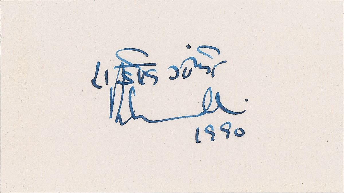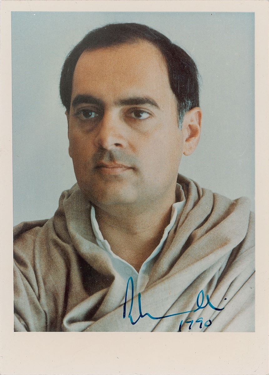 Two items: a color glossy 5 x 7 photo of Rajiv Gandhi, nicely signed in blue ink and dated 1990; and an ink signature of Rajiv Gandhi, also dated 1990, on an off-white 4.75 x 2.75 slip. In overall fine condition.