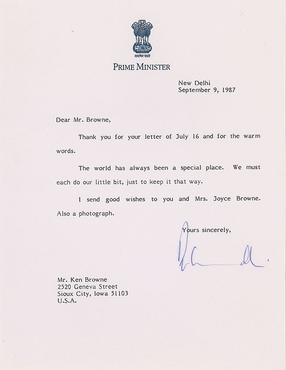 TLS, one page, 7 x 9, Prime Minister letterhead, September 9, 1987. Letter to Ken Browne, in full: "Thank you for your letter of July 16 and for the warm words. The world has always been a special place. We must each do our little bit, just to keep it that way. I send good wishes to you and Mrs. Joyce Browne. Also a photograph." Includes the referenced photo, which features a printed signature. In very fine condition. Accompanied by the original mailing envelope.