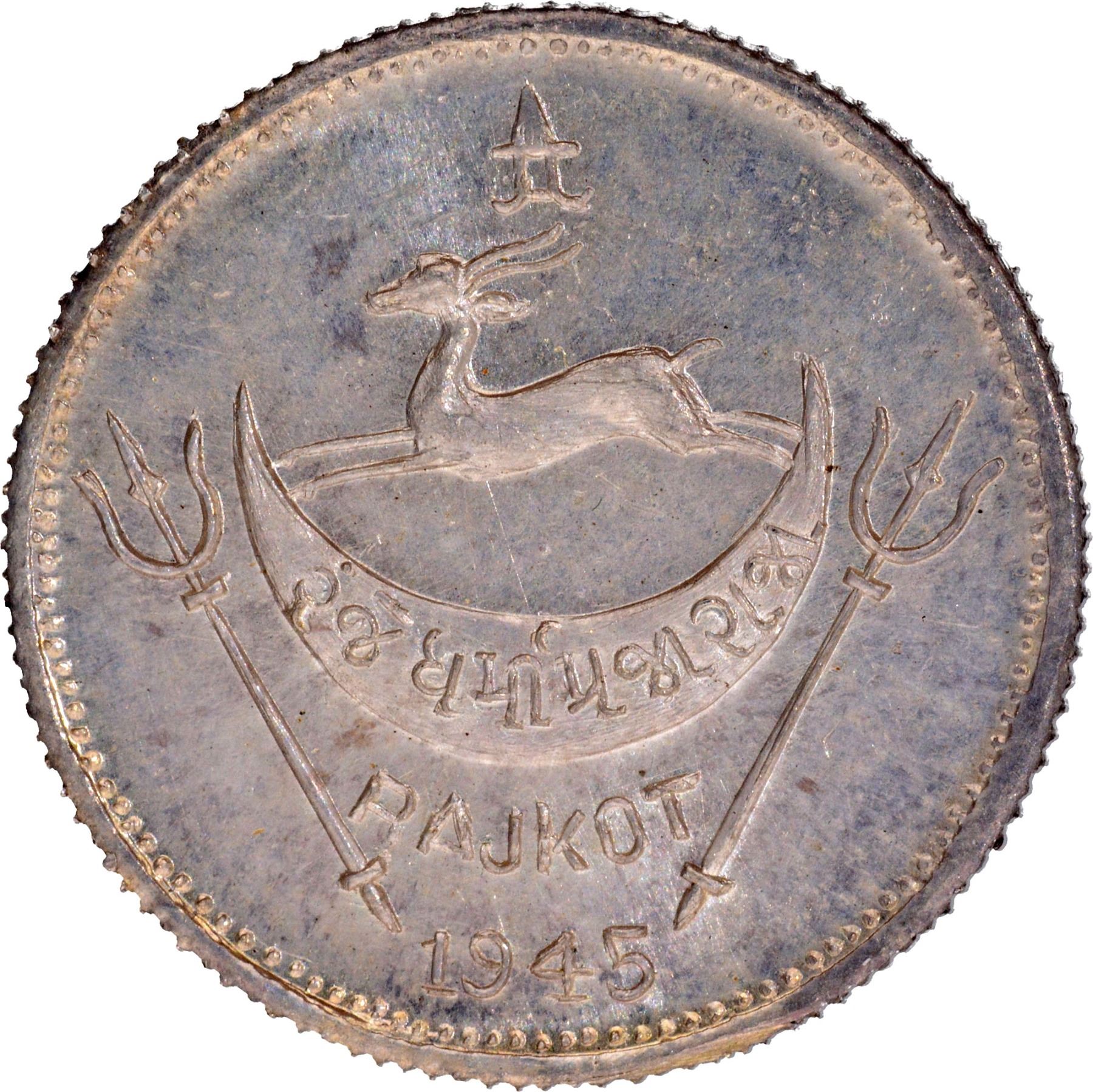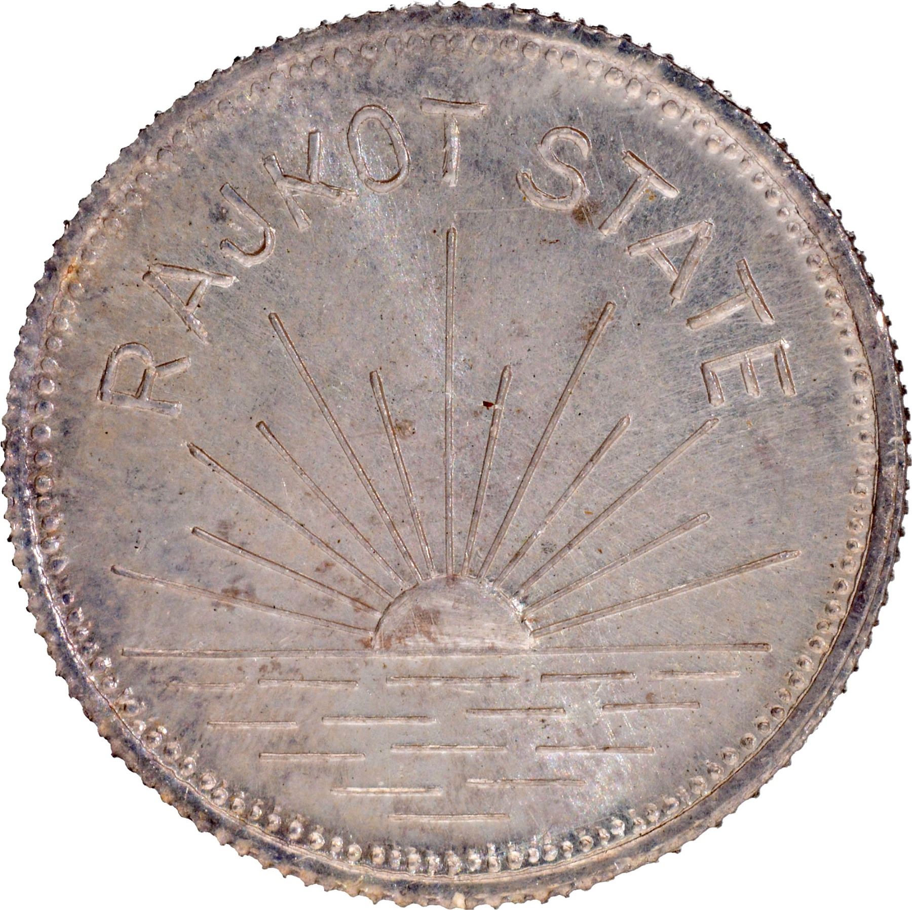 Rajkot State, Dharmendra Singhji (1930-1948 AD), Silver Mohur, 1945 AD, Restrike Issue, Obv: a sunrise view with the English legend Rajkot State, Rev: the coat of arms and the year at the bottom,5.88g, 19.79mm, (KM # X1a), superb lustre, gem quality,UNC, Rare.