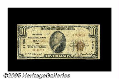 <B>Rake, IA</B></I> - $10 1929 Ty. 1 <B>The Farmers First NB</B></I> Ch. # 11735<BR>This <B>Abt. Fine</B></I> Serial #1 is the only surviving #1 from this small institution in Winnebago County. Its total issue aggregated only $26,580 before it fell victim to the ravages of the Depression in the Fall of 1933. This note is an old friend, having passed through our September, 2002 sale in conjunction with the Greater Cincinnati Numismatic Exposition, where it sold for $1,466.25. With interest in scare to rare Nationals and Serial #1 notes at an all-time high, that will likely be the starting point for this evening's expectations.