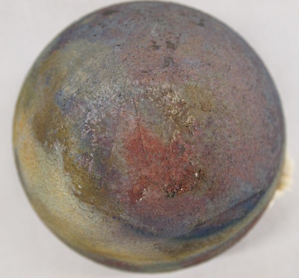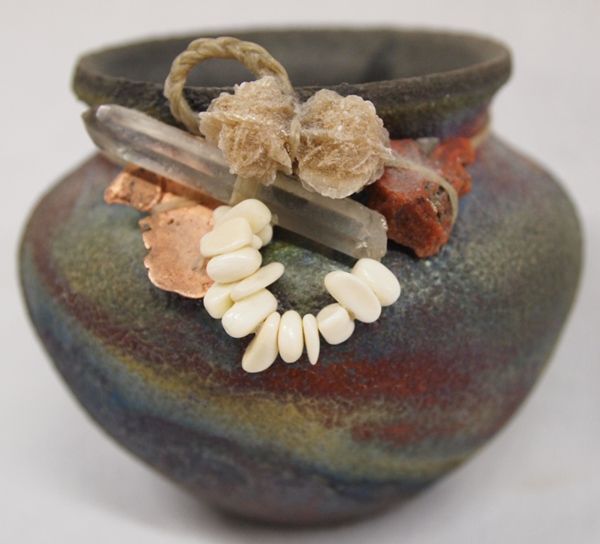 Raku Pottery Jar with Calcite, Crystal, Copper, & Shell fetish bundle, hallmarked MY on bottom of jar, beautiful colors