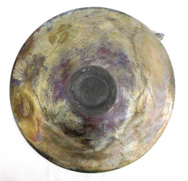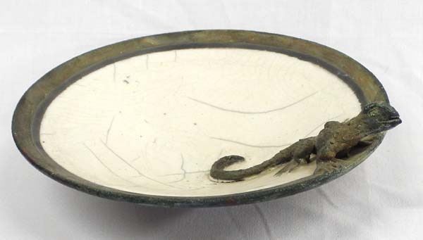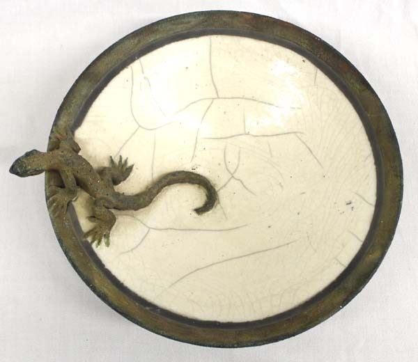 Raku Pottery Lizard Bowl, measures 3''H x 11''D and has artist's initials on the bottom A.R.
