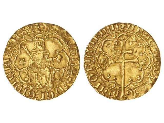 Ral d´or. PERE III. MALLORCA. Anv.: x escudito. ¶PETRUS¶DEI¶GRACIA¶REX: escudito. Rey entronizado de frente. Marca: venera. Rev.: ¶ARAGONUM¶ET-MAIORICARUM. Cruz patriarcal entre veneras. 3,82 grs. Cru.VS-434. MBC+.