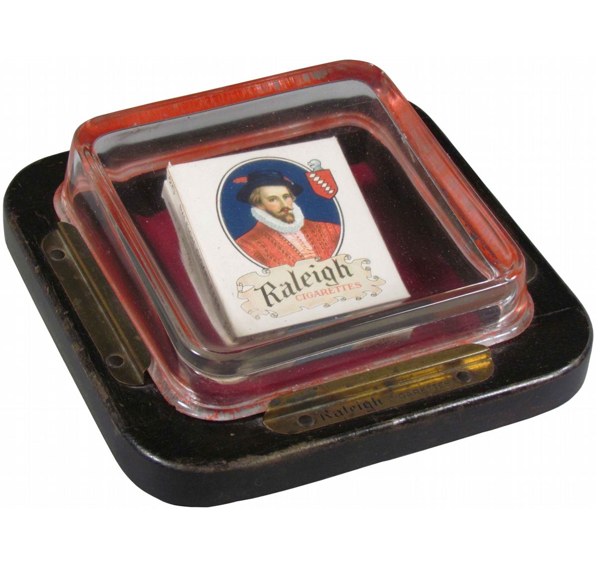 Raleigh Cigarettes Glass Change Tray. Brunhoff Mfg. Cincinnati, makers. Good condition. 7 1/2 inches square X 2 inches tall.