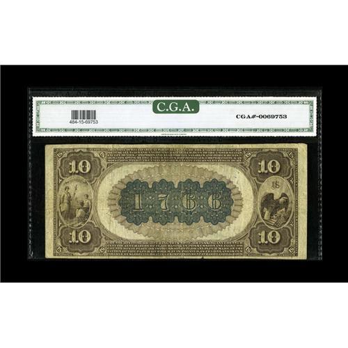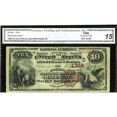 <B>Raleigh, NC</B></I> - $10 1882 Brown Back Fr. 484 <B>The Citizens NB </B></I> Ch. # (S)1766<BR>This is the first time we have had the pleasure to offer a note of this type from here. Though the signatures have faded they are still slightly visible. Overall, we agree with CGA's finding of <B>Fine 15.</B></I> According to the Kelly census this is the finest of only three examples known.