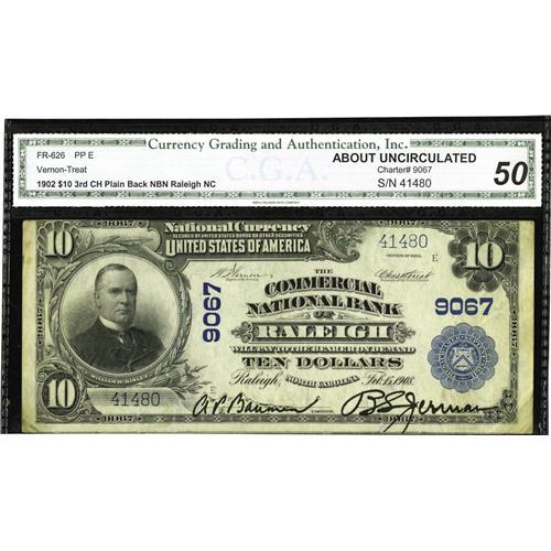 <B>Raleigh, NC</B></I> - $10 1902 Plain Back Fr. 626 <B>The Commercial NB </B></I> Ch. # 9067<BR>Boldly printed signatures of A.P. Bauman and B.S. Jerman are found on this lightly handled state capital $10. A bit of light foxing is seen around the edges. CGA <B>About Uncirculated 50.</B></I>