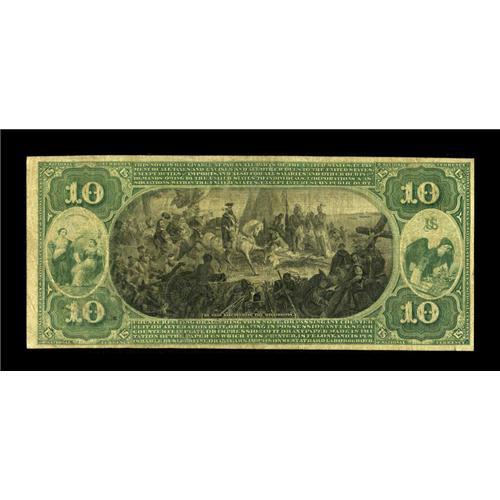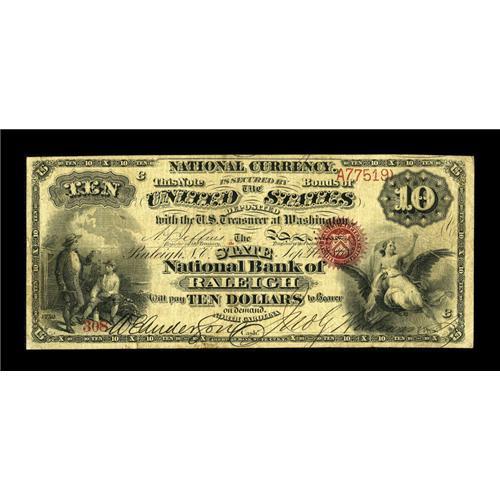 <B>Raleigh, NC</B></I> - $10 Original Fr. 413 <B>The State NB</B></I> Ch. # 1682<BR>If ever a First Charter had everything going for it, this one does. It is one of two notes known from this state capital institution that issued First Charter examples only before liquidating in 1888 at the expiration of its charter. It also bears the excessively rare Jeffries-Spinner Treasury signature combination, with this not only the only $10 example from North Carolina with these signatures but the sole reported $10 from any bank in the entire country. Fortunately for collectors, it is a most attractive specimen as well, being a nicely margined piece displaying great color and eye appeal for the grade. When we last offered this note six years ago, it sold to a major North Carolina collector at a then record price of $23,100 against a pre-sale estimate of $10,000-15,000. Expect this trophy item to bring more, and likely substantially more, before the hammer falls this evening. <B>Fine-Very Fine.</B></I><BR><BR><b>Shipping:</b> Coins & Currency (<a target="_blank" href="http://www.heritageauctions.com/common/shipping.php">view shipping information</a>)