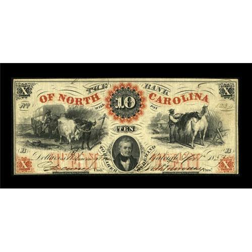 <B>Raleigh, NC- Bank of North Carolina</B></I> $10 Nov. 1, 1859 G94 <BR> This slavery vignette note comes from the bank's Wilmington branch. We have offered only a couple of notes on this branch over the years. <B>Fine-Very Fine.</B></I><BR><BR><b>Shipping:</b> Coins & Currency (<a target="_blank" href="http://www.heritageauctions.com/common/shipping.php">view shipping information</a>)