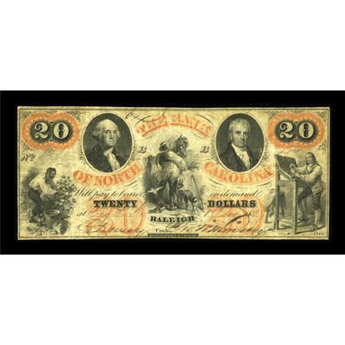 <B>Raleigh, NC- Bank of North Carolina</B></I> $20 Nov. 1, 1859 G36<BR> A very scarce note payable at the bank's branch in Fayetteville. Pleasing <B>Fine.</B></I><BR><BR><b>Shipping:</b> Coins & Currency (<a target="_blank" href="http://www.heritageauctions.com/common/shipping.php">view shipping information</a>)