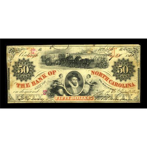 <B>Raleigh, NC- Bank of North Carolina</B></I> $50 May 20, 1861 G8<BR> An extraordinary rarity which came from our landmark North Carolina offering in September, 2003, where this piece realized $3105 against a pre-sale estimate of $750-1250. <B>Fine-Very Fine, </B></I>and likely to see just as much action tonight as it did over four years ago. <BR><I>From The Collection of a Louisiana Gentleman.</B></I><BR><BR><b>Shipping:</b> Coins & Currency (<a target="_blank" href="http://www.heritageauctions.com/common/shipping.php">view shipping information</a>)