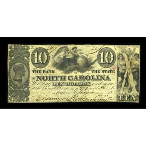 <B>Raleigh, NC- Bank of the State of North Carolina</B></I> $10 May 1, 1856 G68<BR> A rare note which is payable at the bank's branch in Charlotte. Nice <B>Fine-Very Fine,</B></I> likely to see bidding easily reach or perhaps well exceed...<BR><BR><b>Shipping:</b> Coins & Currency (<a target="_blank" href="http://www.heritageauctions.com/common/shipping.php">view shipping information</a>)