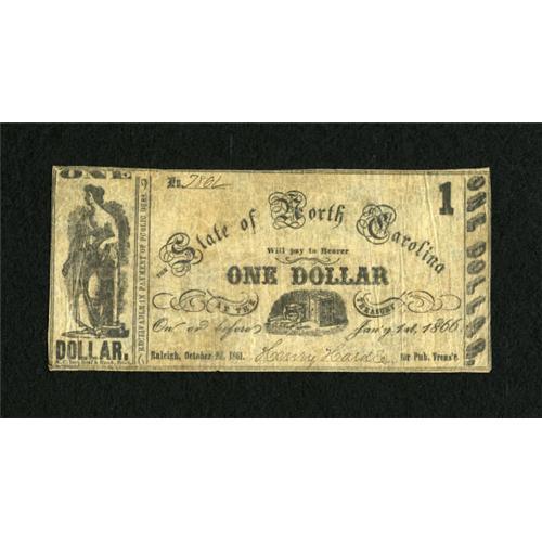 <B>Raleigh, NC- State of North Carolina</B></I> $1 Oct. 5, 1861<BR> This much better variety was printed by the North Carolina Institute for the Deaf & Dumb on the backs of unissued sheets. The edges and paper are nice for the grade. <B>Fine.</B></I><BR><BR><b>Shipping:</b> Coins & Currency (<a target="_blank" href="http://www.heritageauctions.com/common/shipping.php">view shipping information</a>)
