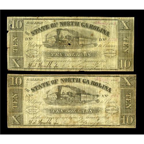 <B>Raleigh, NC- State of North Carolina</B></I> $10; $10 Mar. 1, 1862 Cr. 84; 84B<BR>The Cr. 84 has the watermarked "TEN" paper and it grades a bright <B>VG</B></I> with a couple of small holes and an edge notch. The Cr. 84B is of the plain paper variety and it grades <B>Fine.</B></I><BR><I>From The William A. "Bill" Bond Collection</B></I><BR><BR><b>Shipping:</b> Coin/Currency (<a target="_blank" href="http://www.heritageauctions.com/common/shipping.php">view shipping information</a>)
