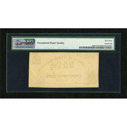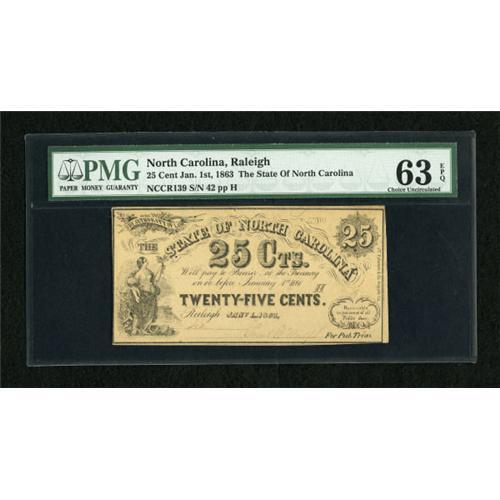 <B>Raleigh, NC- State of North Carolina</B></I> 25¢ Jan. 1, 1863 Cr-139<BR> This NC serial number 42 is graded <B>PMG Choice Uncirculated 63 EPQ</B></I>.<BR><BR><b>Shipping:</b> Coins & Currency (<a target="_blank" href="http://www.heritageauctions.com/common/shipping.php">view shipping information</a>)