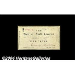 Raleigh, NC- State of North Carolina 5ó Oct. 1, 1861 Cr. CT-48A note listed in Criswell without price and with the notation "Rare." This example is a barely circulated and very bright Extremely Fine specimen with a small repaired split. <BR><BR><B>Important notice:</B> Heritage usually auctions material at the rate of 200-250 lots per hour. On some occasions eBay Live bid software or the Internet may not be able to keep up with the pace of the auction. We recommend placing a realistic absentee bid now as insurance to avoid disappointment. Occasionally the auctioneer may eliminate or reject an eBay Live bid, and the auctioneer may also reopen a lot after the close of the eBay live bidding (usually because we missed an audience bid), and may reject your bid even if it shows you as the winning bidder. By bidding via eBay Live, you agree that Heritage may award the lot to another bidder at its sole discretion under the circumstances described above or any other reasonable circumstances. Since eBay bids are not shown to us until we open the lot on the floor, we treat those bids just like floor bids. In most cases the floor responds before the eBay bid is presented to us, due to Internet lag time, so for consistency we have made it a policy that floor bids are always considered first over tie eBay live bids. Also please note that all Heritage lots purchased through eBay Live carry a 20% Buyer's Premium. Please make sure you read the Terms and Conditions before you bid. <BR><BR><B>IMPORTANT ANNOUNCEMENT ABOUT RESERVES:</B> Heritage now divulges all reserves on its web site 7 days before every auction. If you want to know whether the reserve on this lot has been met, and if not, what the reserve amount is, please visit this lot page on the HeritageCoin.com web site, or email: bid@HeritageGalleries.com