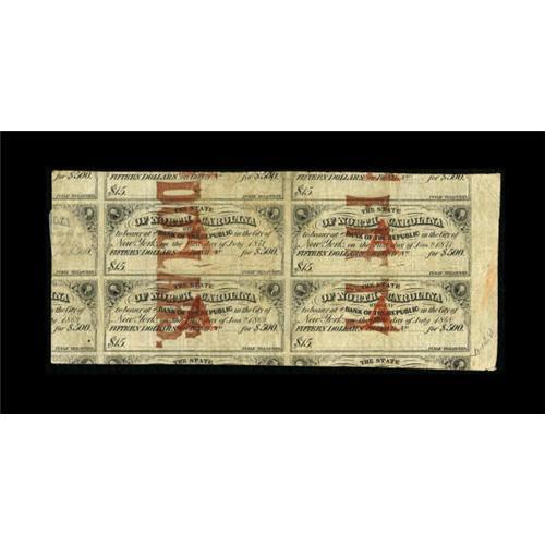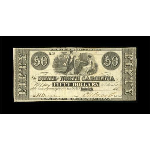 <B>Raleigh, NC- State of North Carolina </B></I>$50 Cr. 74C<BR> A more than acceptable example of this very tough note. <B>Fine-Very Fine, </B></I>with a repair at right fixed with a hinge on the reverse. <BR><I>From The Collection of a Louisiana Gentleman.</B></I><BR><BR><b>Shipping:</b> Coins & Currency (<a target="_blank" href="http://www.heritageauctions.com/common/shipping.php">view shipping information</a>)
