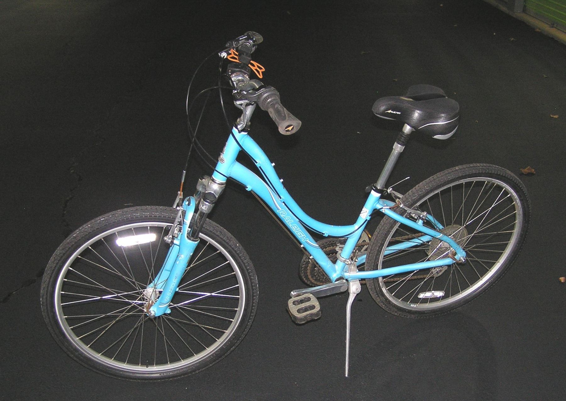 Raleigh high quality multi speed mountain bike with cell phone holder and nice padded cushion seat est. value $450.00-$500.00