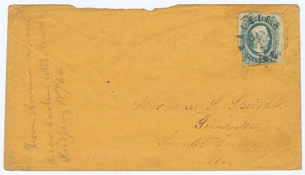 Confederate #11, greenish blue, on orange cover. Socked on nose "Raleigh N.C. / Jan 5 '1864]." To "Mrs. Marie S. Speight, Gainesville, Sumter County, Ala." In contemporary pencil, "From Annie about dear darling little Freddie'?]. Recd. Jan. 19/64." Lacking most of flap, stamp irregularly trimmed at lower left and bottom, but wide margin at right; hinge and mounting evidence on verso, flap originally sealed by sender with a strong mucilage, old-time collector's small six-pointed star rubber-stamped on verso, minor handling, else very good.