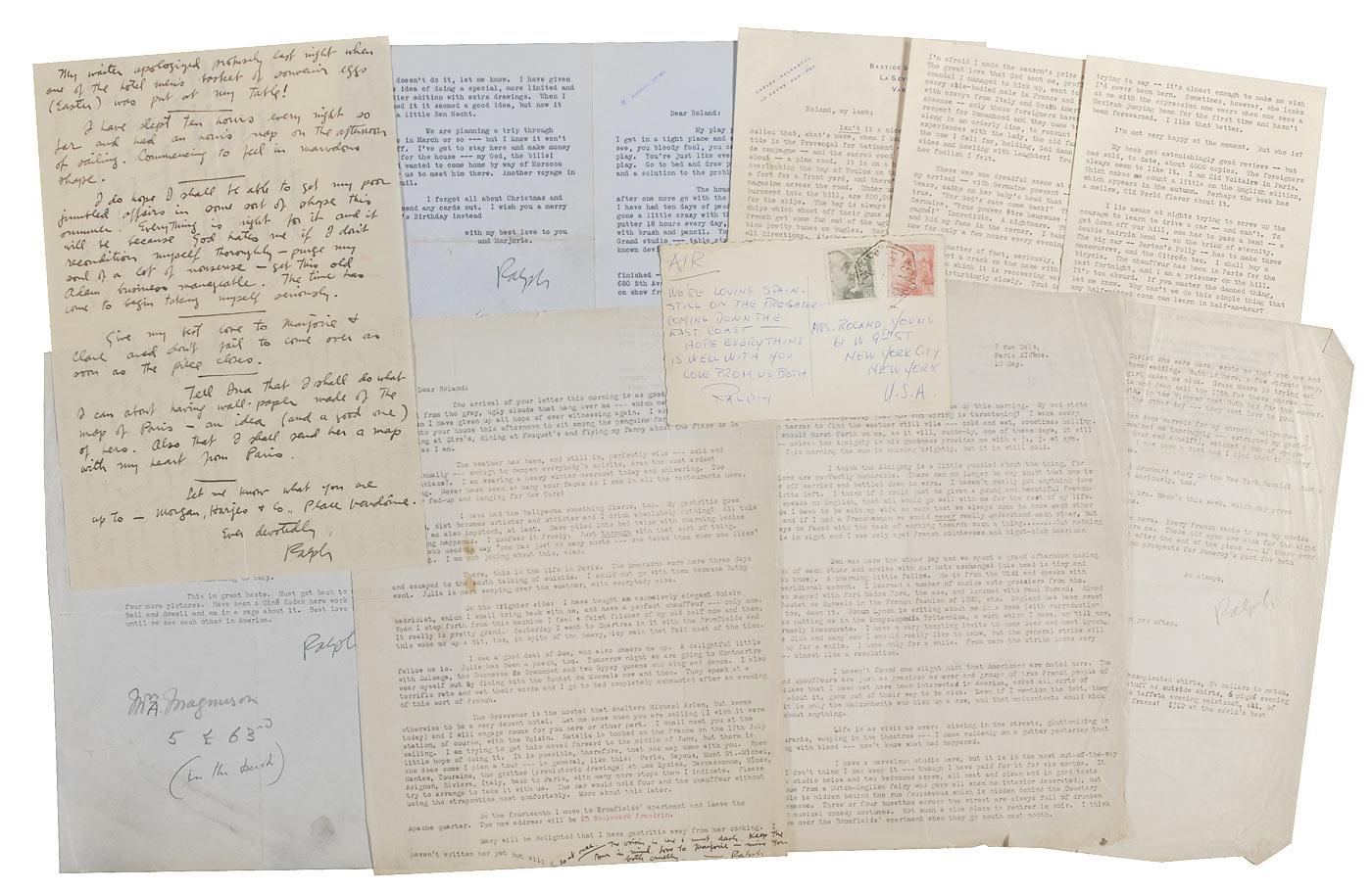Artist (1891-1931) best known for his cartoons and caricatures of actors and other celebrities. Though his work was heavily in demand through the 1920s and is often considered to epitomize the era, his personal life was troubled by mental illness, and he was nearly forgotten soon after his suicide, shortly before his fortieth birthday. A collection of seven letters, all signed “Ralph,” consisting of five TLSs, including two multi-page letters; a four-page (on two adjoining sheets) ALS, and a postcard. The ALS is dated April 6, 1926, with the other letters dated with the day and month only, or undated.All letters are to Roland Young. Most of the letters are written while working and living in France, with the postcard telling of a trip to Spain, and the ALS writen aboard the SS France crossing the Atlantic. One letter mentions Charlie Chaplin, and reads, in part: “Charlie, like me, was having his change of life - his Crisis of Forty Years. I went out to be consoled, and found him in a worse state than I was in. I ended by holding his hand instead of his holding mine…I’m afraid I made the season’s prize ass of myself. The great love that God sent me, profiting by the scandal I managed to kick up, went to bye-bye with every able-bodied male in France and Switzerland with envoys from Italy and South America during my absence - only these foreigners haven’t our respect for womanhood and they came to see me, passing along in an orderly line, to recount their experiences with the lady, the old familiar line, the one I fell for, holding, God damn it, their sides and howling with laughter! You can imagine how foolish I felt.” Another letter, dated June 4, has Barton describing his treatment for gastritis and confesses “I am also impotent, at last. Have piled into bed twice with charming ladies and nothing happened. I confess it freely. Just through with that sort of thing. The kids who used to say ‘one has just so many shots - one takes them when one likes’ were right. I am not joking about this, alas.” In very good overall condition, with folds, creases, and toning. Barton’s last work before his suicide at the age of 39 was that of Charlie Chaplin. A very interesting accounting of Barton’s life, relationships, and work while in France.