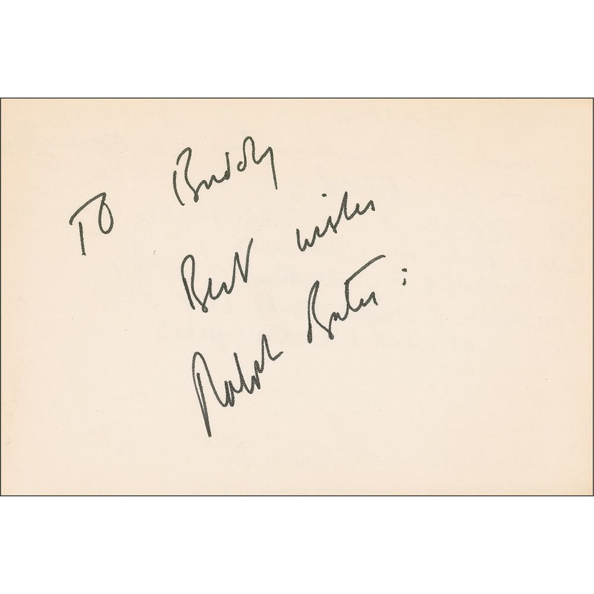 English actor (1940–1991) who, at one time, was the one of the most lauded and best-known actors from Hammer Horror’s, appearing in such cult classics as The Horror of Frankenstein, Taste the Blood of Dracula, Lust for a Vampire, and Dr. Jekyll and Sister Hyde. Felt tip signature and inscription, “To Buddy, Best Wishes, Robert Bates,” on an off-white 6 x 4 card. In fine condition, with light creasing and toning.