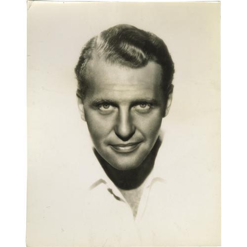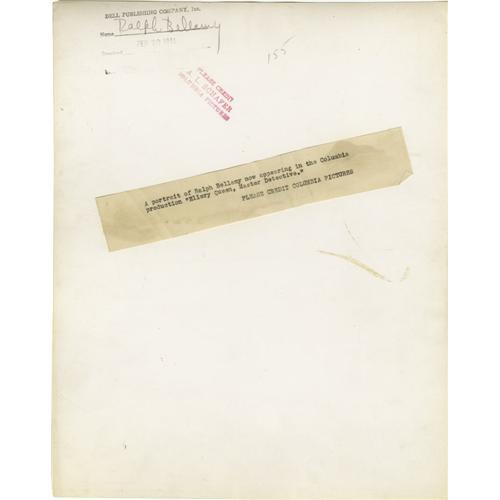 <B>Ralph Bellamy 11" x 14" Portrait.</B></I> The film career of Ralph Bellamy (1904-1991) spanned from 1931 to 1990, including a 1987 Honorary Oscar " for his unique artistry and his distinguished service to the profession of acting." This handsome 11" x 14" portrait of Bellamy comes from <I>Ellery Queen, Master Detective</B></I> (1940), and the verso includes the stamp of Columbia Pictures photographer A.L. Shafer, a Dell Publishing Company stamp dated February 20, 1941 and the original "snipe" with the actor's name and film's title. Some damage in upper left corner - otherwise Very Fine + condition.<BR><BR><b>Shipping:</b> Flat Material, Small (<a target="_blank" href="http://www.heritageauctions.com/common/shipping.php">view shipping information</a>)
