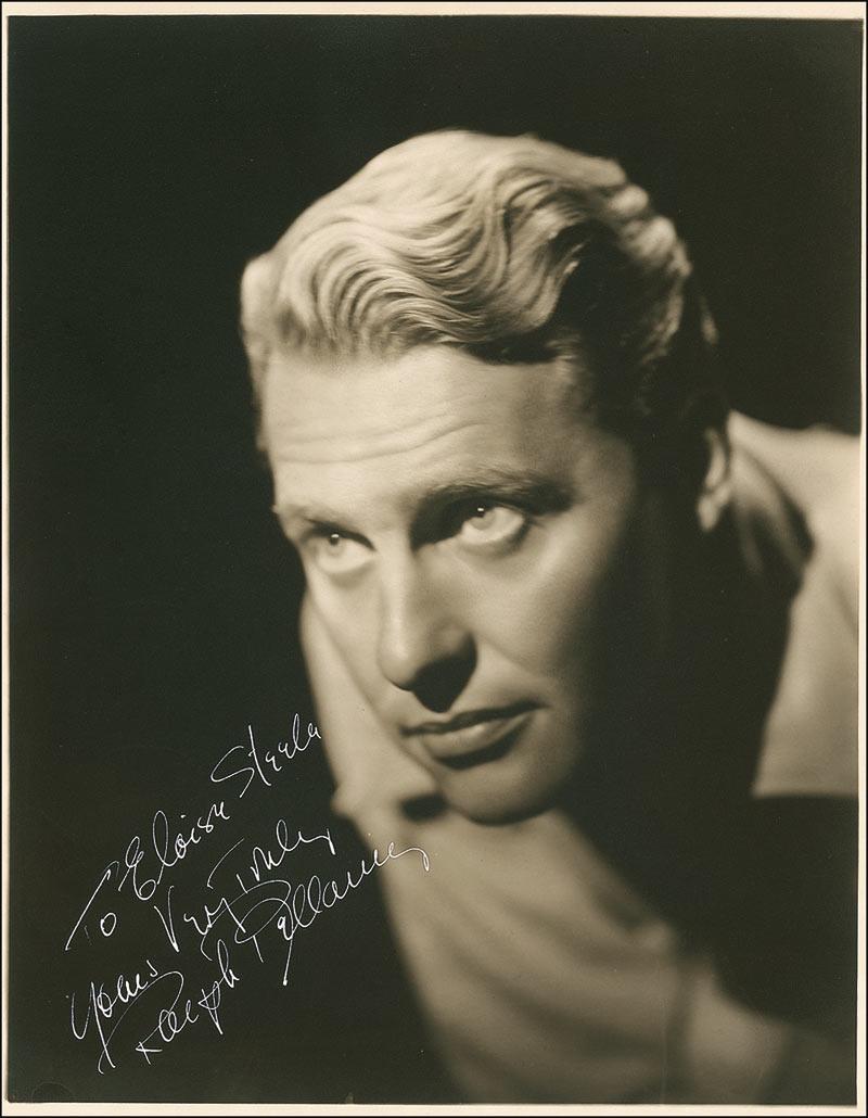 Vintage matte-finish 7.75 x 10 photo of Bellamy bathed in soft light, signed and inscribed in white ink “To Eloise Steele, Yours very truly, Ralph Bellamy.” In fine condition, with lightly trimmed vertical edges.