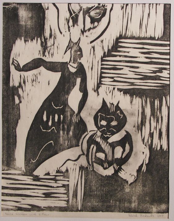, Ralph Berkowitz , Woodblock , "Young Woman With Kittens" , 15" x 12" , Pencil Signed Right , (7638)