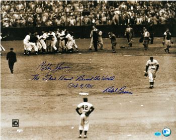 Ralph Branca is perhaps best remembered for one infamous relief appearance in a 1951 NL playoff game at the Polo Grounds against the crosstown rival New York Giants. Branca entered the game in relief of Don Newcombe in the bottom of the ninth inning with one out and Whitey Lockman on second base and pinch runner Clint Hartung on third base and surrendered a walk-off home run known as the Shot Heard 'Round the World to Bobby Thomson, giving the Giants the pennant and the win to Larry Jansen. Ralph Branca and Bobby Thomson have hand signed this 16x20 Photo with The Shot Heard Round the World Oct 3, 1951 inscription. Certificate of Authenticity from Athlon Sports.