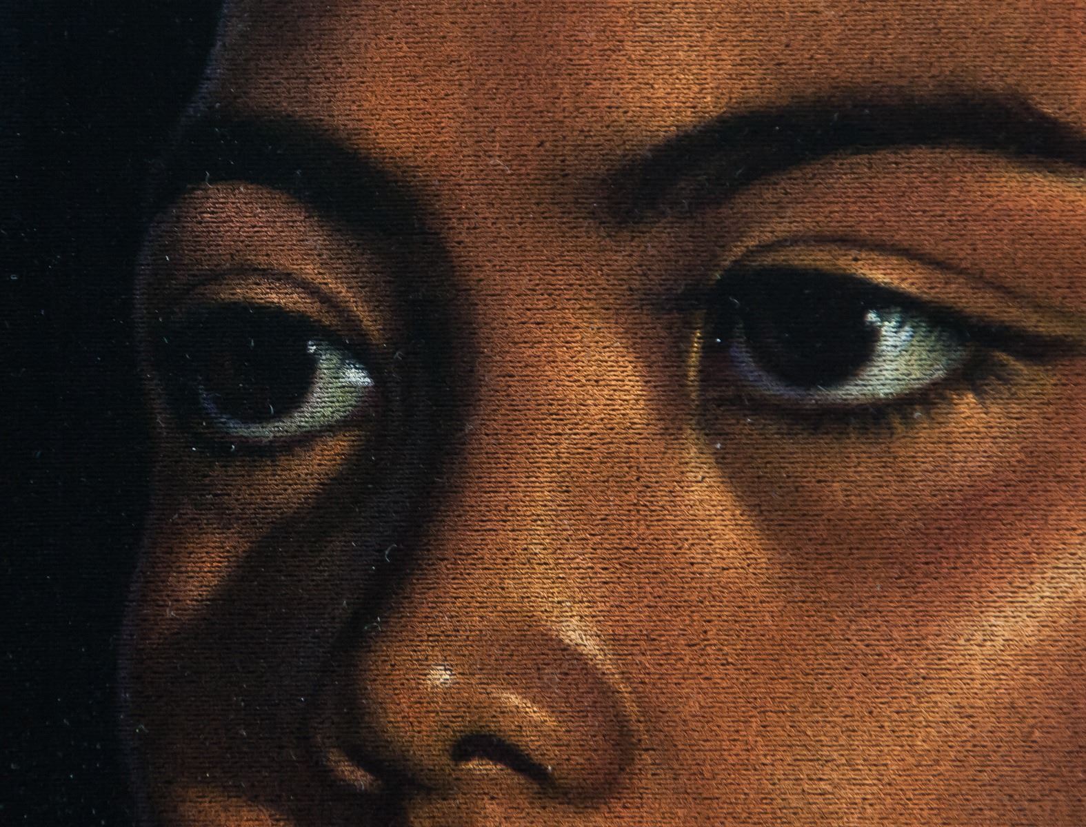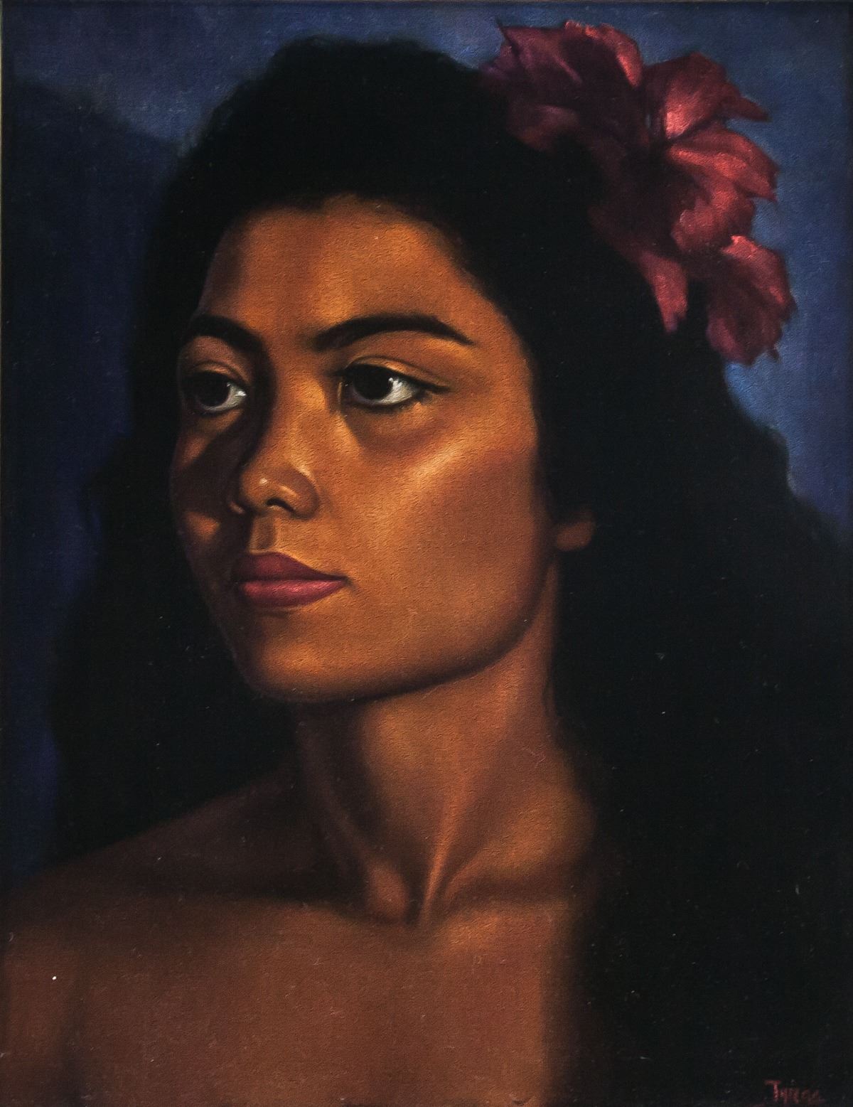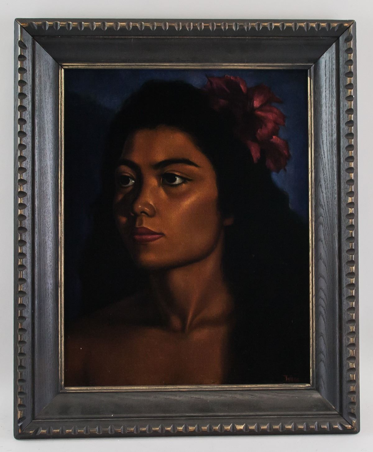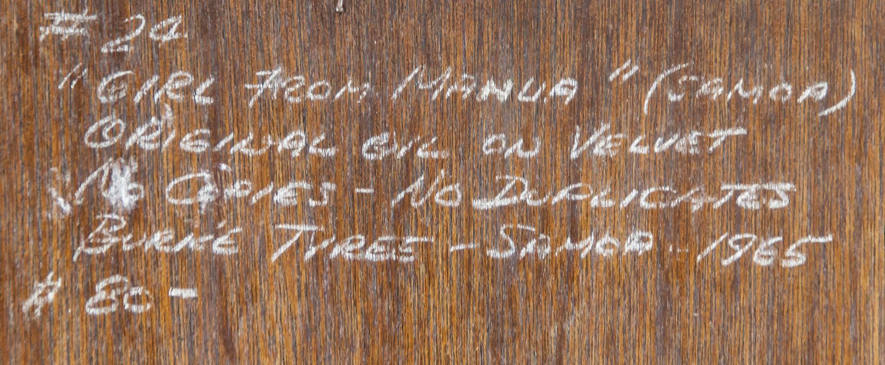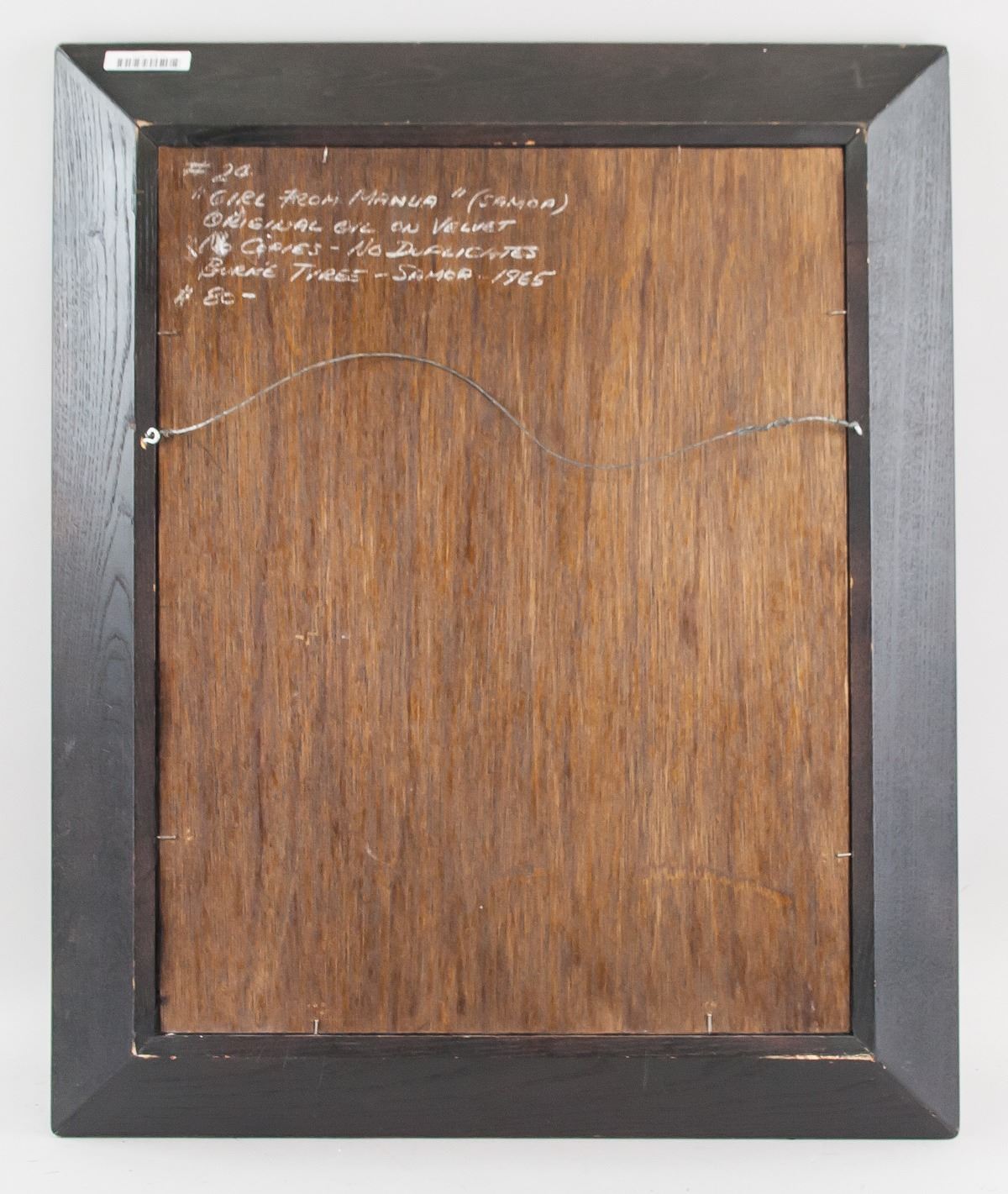Oil on velvet, framed. Featuring a portrait and entitled, "Girl from Manua (Samoa)" Signed Tyree on the lower right corner. Inscription on verso, "#24 / 'GIRL FROM MANUA' (SAMOA) / ORIGINAL OIL ON VELVET / NO COPIES - NO DUPLICATES / BURKE TYREE - SAMOA - 1965 / #80 -. Attributed to Ralph Burke Tyree (1921-1979, American). 45.5 x 35.5 cm (17.9 x 14.0 inches). Framed size: 58 x 48 cm (22.8 x 18.9 inches)