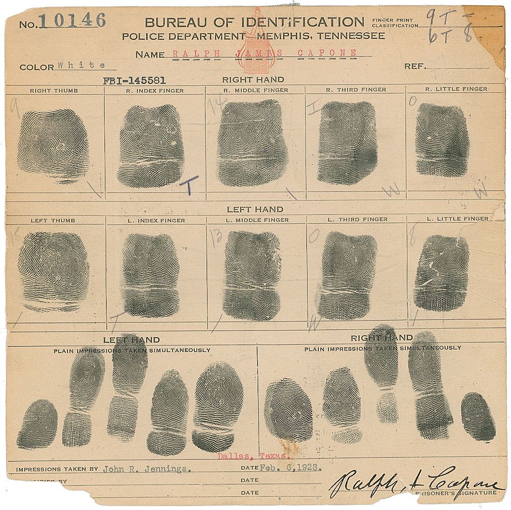 Older brother of Al Capone who was once named ‘Public Enemy Number Three’ and nicknamed ‘Bottles’ because he ran the Chicago bottling operation (1894–1974). Memphis police department identification card, one page both sides, 8 x 8, February 5, 1928, bearing Capone’s fingerprints individually as well as prints of all fingers simultaneously, signed at the bottom in black ink, “Ralph J. Capone.” Opposite side bears typed information about Capone, including name and aliases, height, weight, tattoos, and charges, as well as an affixed mug shot. Moderate overall creases, various edge chips and tears (one affecting the signature), a few affixed pieces of toned tape, and various notations, otherwise very good condition.