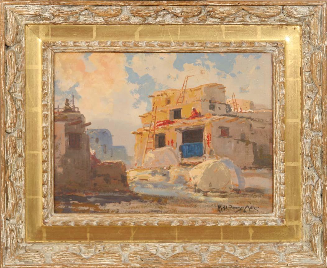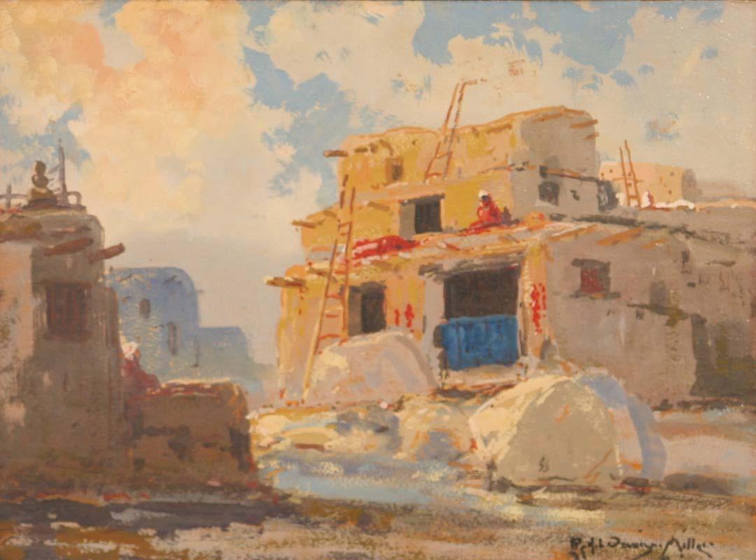 Ralph Davison Miller (1858-1945). Pueblos. 12" x 16" oil on board. Signed lower right. (est $1,000-1,500). For condition reports please visit: www.auctioninsantafe.com/cr2011.pdf