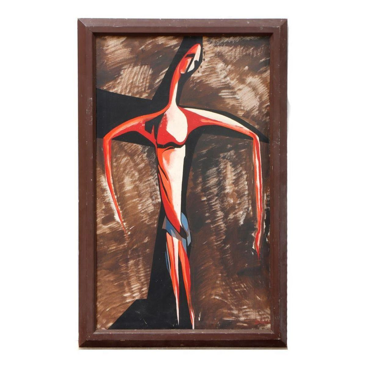 Artist: Ralph DuCasse (1916-2003). Title/Description: Abstracted crucifixion. Signature: Signed lower right. Date Created: 1949. Medium/Ground: Oil on canvas. Size: 44in x 26in; 48 3/4in x 30 1/2in (frame). Condition: Craquelure, surface scuffing, losses. From the Family of Xavier Martinez (1869-1943), Elsie Whitaker Martinez (1890-1984), and Micaela Martinez DuCasse (1913-1989).