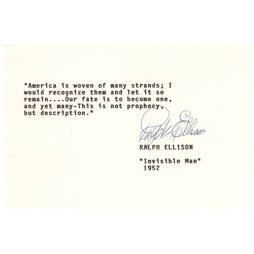 TQS on an off-white 6 x 4 card, signed in blue ballpoint, "Ralph Ellison." A quote from his important 1952 novel Invisible Man, in full: "America is woven of many strands; I would recognize them and let it so remain…Our fate is to become one, and yet many—This is not a prophecy, but description." In very fine condition.
