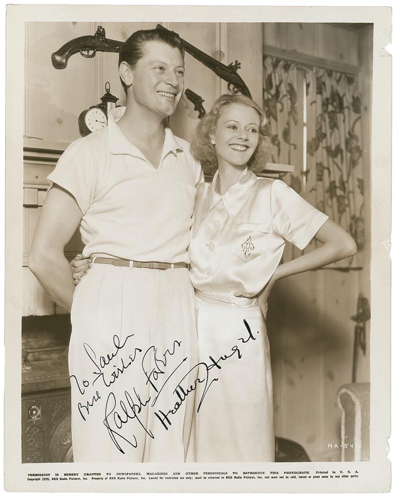 Vintage sepia glossy 10 x 8 RKO publicity photo of the couple, signed and inscribed in-person in fountain pen “To Saul, Best wishes, Ralph Forbes,” and “Heather Angel.” Reverse of photo bears collector’s stamp date of July 16, 1940, the date the signature was acquired. Heavy binder dings to right edge and a few light streaks to emulsion, otherwise fine condition. Saul Goodman Collection.