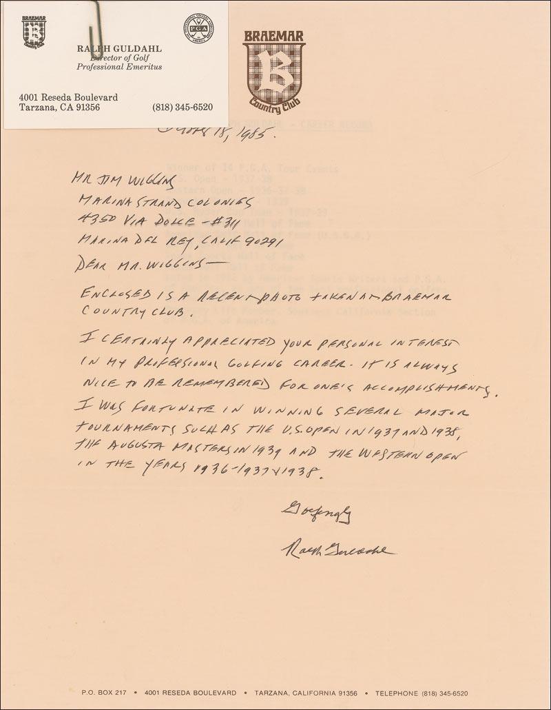 Member of both the PGA and World Golf Halls of Fame. TLS, one page, 8.5 x 11, Braemar Country Club letterhead, October 18, 1985. Letter to an admirer. In part: “I certainly appreciated your personal interest in my professional golfing career…I was fortunate in winning several major tournaments such as the U.S. Open in 1937 and 1938, the Augusta Masters in 1939 …” Guldahl has paperclipped his business card and a sheet of his victories to the letter as well. In fine condition.