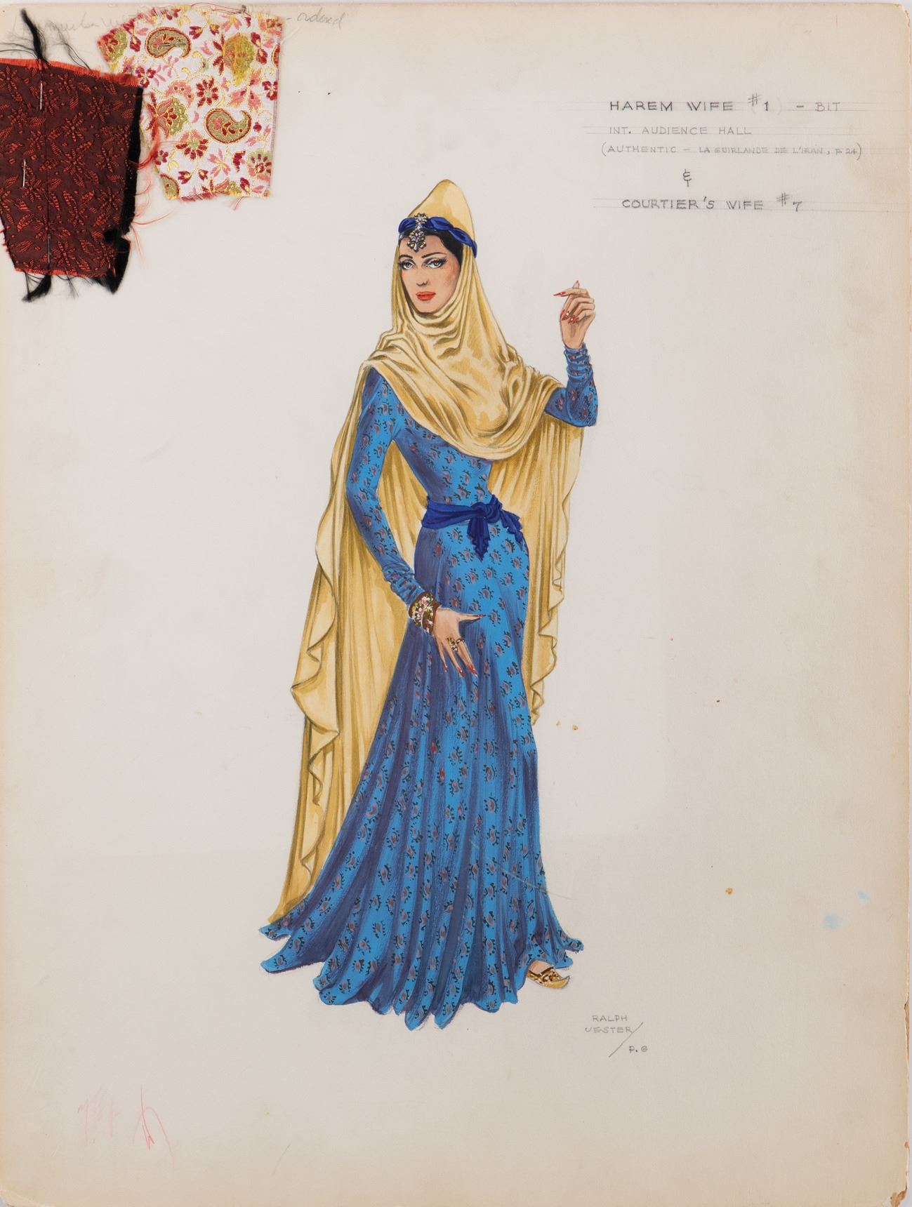 159. Ralph Jester "Harem Wife" costume sketch from Omar Khayyam.(Paramount, 1957) Vintage original sketch accomplished in pencil and gouache on 13 x 18.75 in. artists board, with annotations in the borders and retaining fabric swatches affixed to upper right corner and studio ink stamp on the verso. Signed by the artist in the lower right. Exhibiting production soiling, age and wear. In vintage good condition. This lot is from the estate of Dwight Richard Odle (1941-2018). Proceeds will go to the St. Jude's Memorial Foundation. $200 - $300