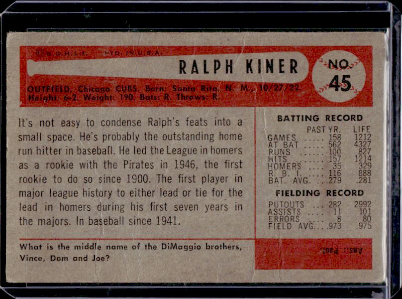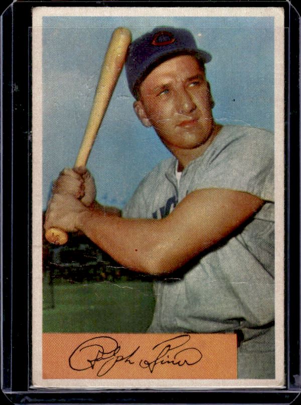 Ralph Kiner 1954 Bowman #45. Condition is extremely good except for some surface defects across the