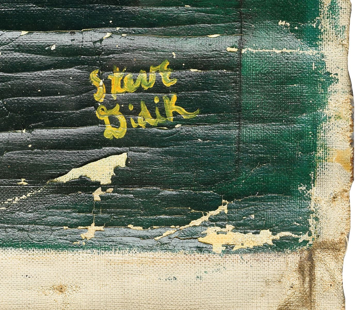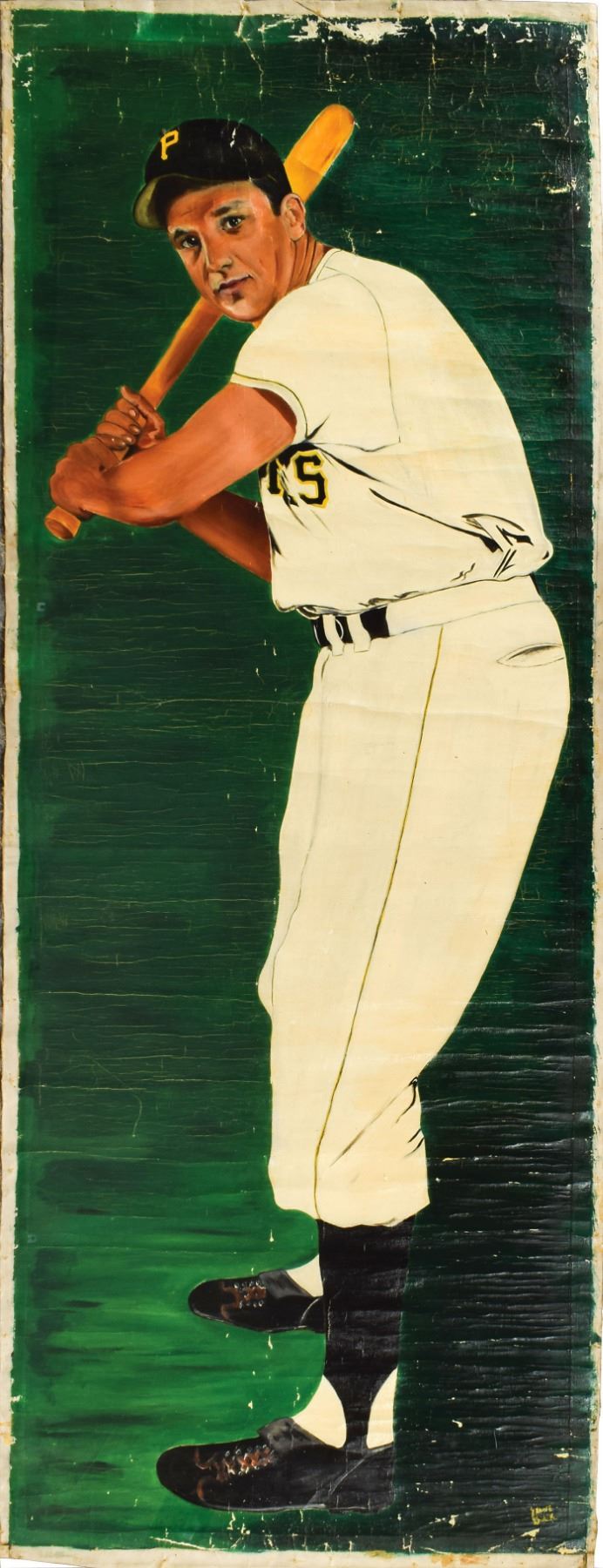 Ralph Kiner's personally owned life-sized self-portrait painting by artist Steve Didik, 28 x 73, accomplished in oil on canvas, depicting the power-hitting Hall of Fame Pittsburgh Pirates left fielder in his batting stance against a green background. Signed in the lower right corner in yellow paint by the artist. Rolled and in very good condition, with overall horizontal cracking to the paint. Consignor notes that the painting was acquired directly from the Kiner family.