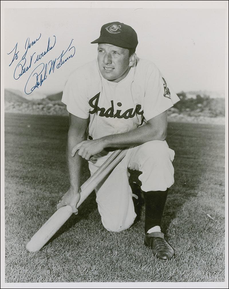 Vintage glossy 8 x 10 photo of Kiner in his Indians uniform, signed and inscribed in blue ink “To Jim, Best wishes, Ralph Kiner.” In fine condition, with a few scattered light surface marks.