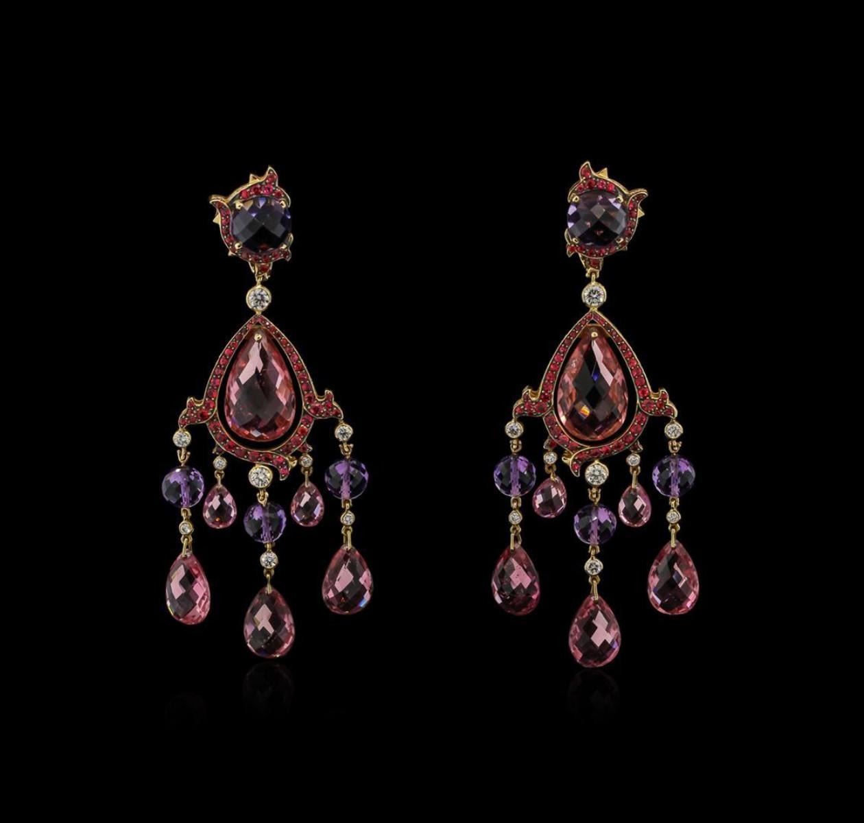 One pair electronically tested 18KT rose gold ladies cast & assembled multi gemstone & diamond dangle earrings with omega backs. Each earring features a floating pink tourmaline set within a red spinel frame supported by pink tourmaline, amethyst and diamond dangles, completed by an amethyst accented by red spinel. The earrings are from Ralph Lauren's New Romantic Collection. Stamped JACV00025. Bright and anodized finish. Trademark is Ralph Lauren. Identified with markings of "750". Condition is good. Containing: Two peg set briolette cut natural pink tourmalines, measuring 16.50 x 10.80 x 5.50mm, approximate total weight of 13.30ct., clarity is eye clean, medium dark, moderately strong, pink color, (GIA Pk 6/4), cut is good. Transmitting light with no distortion, transparent. Color grade is an average for the pair. Graded in the setting. Six peg set briolette cut natural pink tourmalines, measuring 11.50 x 9.00 x 5.00mm, approximate total weight of 21.00ct., clarity is eye clean, medium dark, moderately strong, pink color, (GIA Pk 6/4), cut is good. Transmitting light with no distortion, transparent. Color grade is an average for the group. Graded in the setting. Four peg set briolette cut natural pink tourmalines, measuring 6.00 x 5.00 x 3.50mm, approximate total weight of 3.00ct., clarity is eye clean, medium dark, moderately strong, pink color, (GIA Pk 6/4), cut is good. Transmitting light with no distortion, transparent. Color grade is an average for the group. Graded in the setting. Six peg set briolette cut natural amethysts, measuring 6.50 x 6.45 x 6.50mm, approximate total weight of 9.60ct., clarity is eye clean, type II, medium dark, moderately strong, purple color, (GIA P 6/4), cut is good. Transmitting light with no distortion, transparent. Color grade is an average for the group. Graded in the setting. Two prong set round cabochon cut natural amethysts, measuring 9.00 x 9.00 x 4.95mm, approximate total weight of 5.80ct., clarity is eye clean, type II, medium dark, moderately strong, purple color, (GIA P 6/4), cut is good. Transmitting light with no distortion, transparent. Color grade is an average for the pair. Graded in the setting. One hundred twenty-six bead set round brilliant cut natural red spinels, measuring 1.70 - 1.20 x 0.94 mm, approximate total weight of 1.36ct., clarity is eye clean, medium dark, moderately strong, slightly purplish red color, (GIA slpR 6/4), cut is good. Transmitting light with no distortion, transparent. Color grade is an average for the group. Graded in the setting. Four bezel set round brilliant cut diamonds, measuring 3.30 - 3.20 x 1.95mm (depth est.) approximate total weight of 4 Stones = 0.50ct. Graded in the setting. Clarity: VS-1 to VS-2. Color: G - H. Six bezel set round brilliant cut diamonds, measuring 2.30 - 2.30 x 1.38mm (depth est.) approximate total weight of 6 Stones = 0.30ct. Graded in the setting. Clarity: VS-1 to VS-2. Color: G - H. Eight bezel set round brilliant cut diamonds, measuring 1.80 - 1.80 x 1.08mm (depth est.) approximate total weight of 8 Stones = 0.20ct. Graded in the setting. Clarity: VS-1 to VS-2. Color: G - H. One Hundred Forty-Eight bead set round brilliant cut diamonds, measuring 1.20 - 0.90 x 0.63mm (depth est.) approximate total weight of 148 Stones = 0.75ct. Graded in the setting. Clarity: VVS-2 to VS-1. Color: G - H. Total Weight of Colored Stones: 54.06 ct. Total Weight of Diamonds: 1.75 ct. Total Weight of Earrings: 27.70 gm. AIG Appraised.