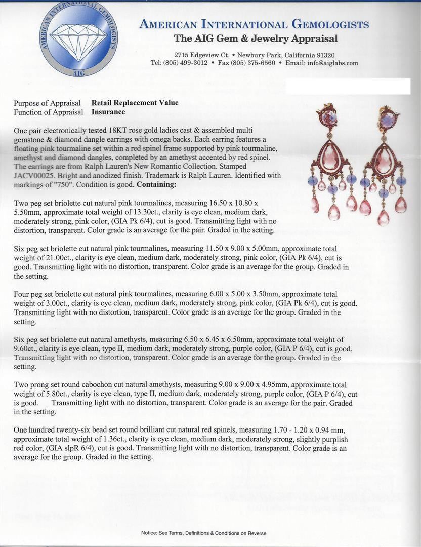 One pair electronically tested 18KT rose gold ladies cast & assembled multi gemstone & diamond dangle earrings with omega backs. Each earring features a floating pink tourmaline set within a red spinel frame supported by pink tourmaline, amethyst and diamond dangles, completed by an amethyst accented by red spinel. The earrings are from Ralph Lauren's New Romantic Collection. Stamped JACV00025. Bright and anodized finish. Trademark is Ralph Lauren. Identified with markings of "750". Condition is good. Containing: Two peg set briolette cut natural pink tourmalines, measuring 16.50 x 10.80 x 5.50mm, approximate total weight of 13.30 ct., clarity is eye clean, medium dark, moderately strong, pink color, (GIA Pk 6/4), cut is good. Transmitting light with no distortion, transparent. Color grade is an average for the pair. Graded in the setting. Six peg set briolette cut natural pink tourmalines, measuring 11.50 x 9.00 x 5.00mm, approximate total weight of 21.00 ct., clarity is eye clean, medium dark, moderately strong, pink color, (GIA Pk 6/4), cut is good. Transmitting light with no distortion, transparent. Color grade is an average for the group. Graded in the setting. Four peg set briolette cut natural pink tourmalines, measuring 6.00 x 5.00 x 3.50mm, approximate total weight of 3.00 ct., clarity is eye clean, medium dark, moderately strong, pink color, (GIA Pk 6/4), cut is good. Transmitting light with no distortion, transparent. Color grade is an average for the group. Graded in the setting. Six peg set briolette cut natural amethysts, measuring 6.50 x 6.45 x 6.50mm, approximate total weight of 9.60 ct., clarity is eye clean, type II, medium dark, moderately strong, purple color, (GIA P 6/4), cut is good. Transmitting light with no distortion, transparent. Color grade is an average for the group. Graded in the setting. Two prong set round cabochon cut natural amethysts, measuring 9.00 x 9.00 x 4.95mm, approximate total weight of 5.80 ct., clarity is eye clean, type II, medium dark, moderately strong, purple color, (GIA P 6/4), cut is good. Transmitting light with no distortion, transparent. Color grade is an average for the pair. Graded in the setting. One hundred twenty-six bead set round brilliant cut natural red spinels, measuring 1.70 - 1.20 x 0.94 mm, approximate total weight of 1.36ct., clarity is eye clean, medium dark, moderately strong, slightly purplish red color, (GIA slpR 6/4), cut is good. Transmitting light with no distortion, transparent. Color grade is an average for the group. Graded in the setting. Four bezel set round brilliant cut diamonds, measuring 3.30 - 3.20 x 1.95mm (depth est.) approximate total weight of 4 Stones = 0.50 ct. Graded in the setting. Clarity: VS-1 to VS-2. Color: G - H. Six bezel set round brilliant cut diamonds, measuring 2.30 - 2.30 x 1.38mm (depth est.) approximate total weight of 6 Stones = 0.30 ct. Graded in the setting. Clarity: VS-1 to VS-2. Color: G - H. Eight bezel set round brilliant cut diamonds, measuring 1.80 - 1.80 x 1.08mm (depth est.) approximate total weight of 8 Stones = 0.20 ct. Graded in the setting. Clarity: VS-1 to VS-2. Color: G - H. One Hundred Forty-Eight bead set round brilliant cut diamonds, measuring 1.20 - 0.90 x 0.63mm (depth est.) approximate total weight of 148 Stones = 0.75ct. Graded in the setting. Clarity: VVS-2 to VS-1. Color: G - H. Total Weight of Colored Stones: 54.06 ct. Total Weight of Diamonds: 1.75 ct. Total Weight of Earrings: 27.70 gm. AIG Appraised.