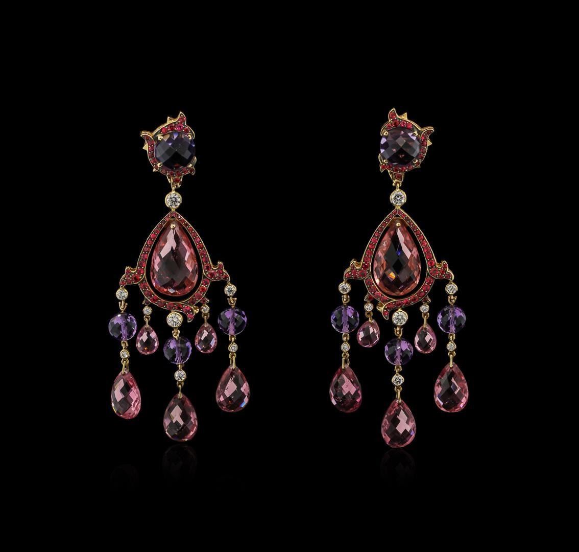 One pair electronically tested 18KT rose gold ladies cast & assembled multi gemstone & diamond dangle earrings with omega backs. Each earring features a floating pink tourmaline set within a red spinel frame supported by pink tourmaline, amethyst and diamond dangles, completed by an amethyst accented by red spinel. The earrings are from Ralph Lauren's New Romantic Collection. Stamped JACV00025. Bright and anodized finish. Trademark is Ralph Lauren. Identified with markings of "750". Condition is good. Containing: Two peg set briolette cut natural pink tourmalines, measuring 16.50 x 10.80 x 5.50mm, approximate total weight of 13.30 ct., clarity is eye clean, medium dark, moderately strong, pink color, (GIA Pk 6/4), cut is good. Transmitting light with no distortion, transparent. Color grade is an average for the pair. Graded in the setting. Six peg set briolette cut natural pink tourmalines, measuring 11.50 x 9.00 x 5.00mm, approximate total weight of 21.00 ct., clarity is eye clean, medium dark, moderately strong, pink color, (GIA Pk 6/4), cut is good. Transmitting light with no distortion, transparent. Color grade is an average for the group. Graded in the setting. Four peg set briolette cut natural pink tourmalines, measuring 6.00 x 5.00 x 3.50mm, approximate total weight of 3.00 ct., clarity is eye clean, medium dark, moderately strong, pink color, (GIA Pk 6/4), cut is good. Transmitting light with no distortion, transparent. Color grade is an average for the group. Graded in the setting. Six peg set briolette cut natural amethysts, measuring 6.50 x 6.45 x 6.50mm, approximate total weight of 9.60 ct., clarity is eye clean, type II, medium dark, moderately strong, purple color, (GIA P 6/4), cut is good. Transmitting light with no distortion, transparent. Color grade is an average for the group. Graded in the setting. Two prong set round cabochon cut natural amethysts, measuring 9.00 x 9.00 x 4.95mm, approximate total weight of 5.80 ct., clarity is eye clean, type II, medium dark, moderately strong, purple color, (GIA P 6/4), cut is good. Transmitting light with no distortion, transparent. Color grade is an average for the pair. Graded in the setting. One hundred twenty-six bead set round brilliant cut natural red spinels, measuring 1.70 - 1.20 x 0.94 mm, approximate total weight of 1.36ct., clarity is eye clean, medium dark, moderately strong, slightly purplish red color, (GIA slpR 6/4), cut is good. Transmitting light with no distortion, transparent. Color grade is an average for the group. Graded in the setting. Four bezel set round brilliant cut diamonds, measuring 3.30 - 3.20 x 1.95mm (depth est.) approximate total weight of 4 Stones = 0.50 ct. Graded in the setting. Clarity: VS-1 to VS-2. Color: G - H. Six bezel set round brilliant cut diamonds, measuring 2.30 - 2.30 x 1.38mm (depth est.) approximate total weight of 6 Stones = 0.30 ct. Graded in the setting. Clarity: VS-1 to VS-2. Color: G - H. Eight bezel set round brilliant cut diamonds, measuring 1.80 - 1.80 x 1.08mm (depth est.) approximate total weight of 8 Stones = 0.20 ct. Graded in the setting. Clarity: VS-1 to VS-2. Color: G - H. One Hundred Forty-Eight bead set round brilliant cut diamonds, measuring 1.20 - 0.90 x 0.63mm (depth est.) approximate total weight of 148 Stones = 0.75ct. Graded in the setting. Clarity: VVS-2 to VS-1. Color: G - H. Total Weight of Colored Stones: 54.06 ct. Total Weight of Diamonds: 1.75 ct. Total Weight of Earrings: 27.70 gm. AIG Appraised.