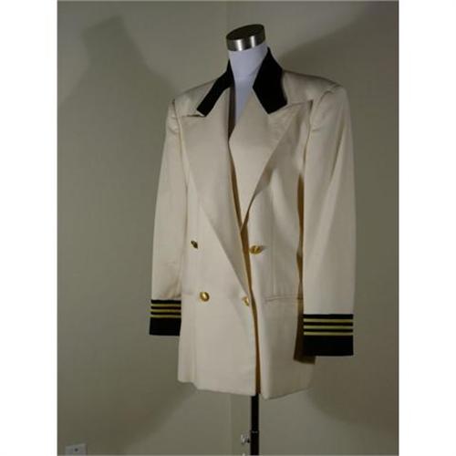 Very dark Midnight Navy Collar and Cuff on an Ivory over sized Captain's jacket with exquisite gold braid details and buttons. A roomy size 10, in excellent condition, dry cleaned and ready to wear. This will fit a size 12, but was designed to be worn very loosely. The label is the Vintage Collection label that preceded purple label.