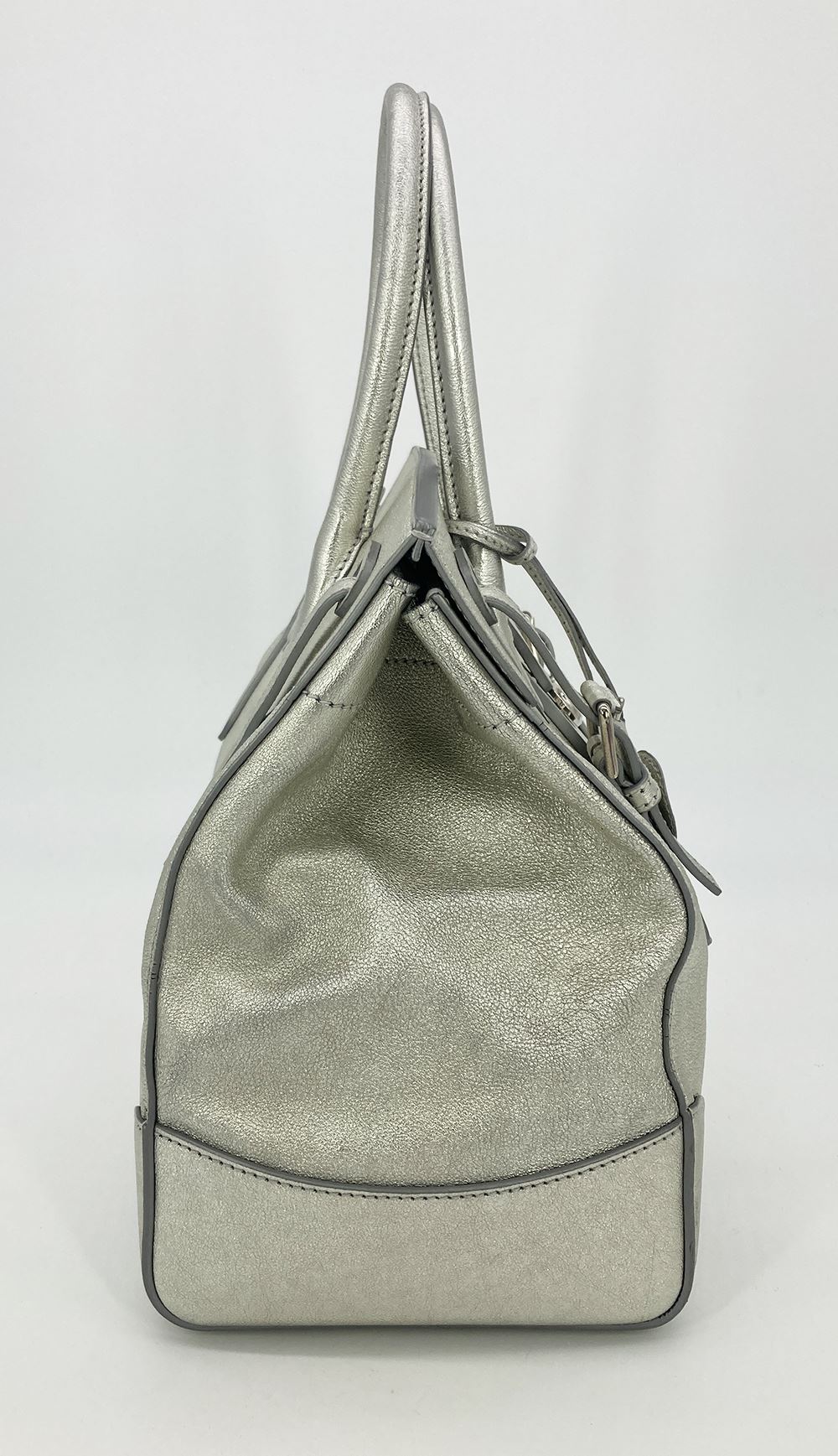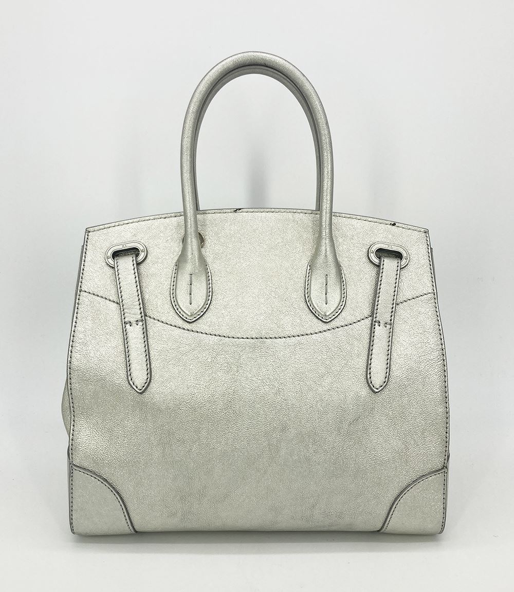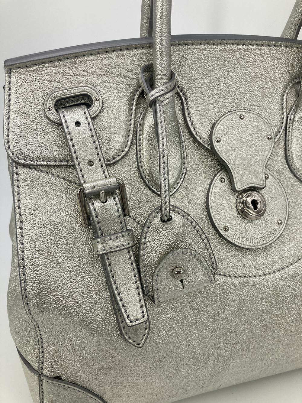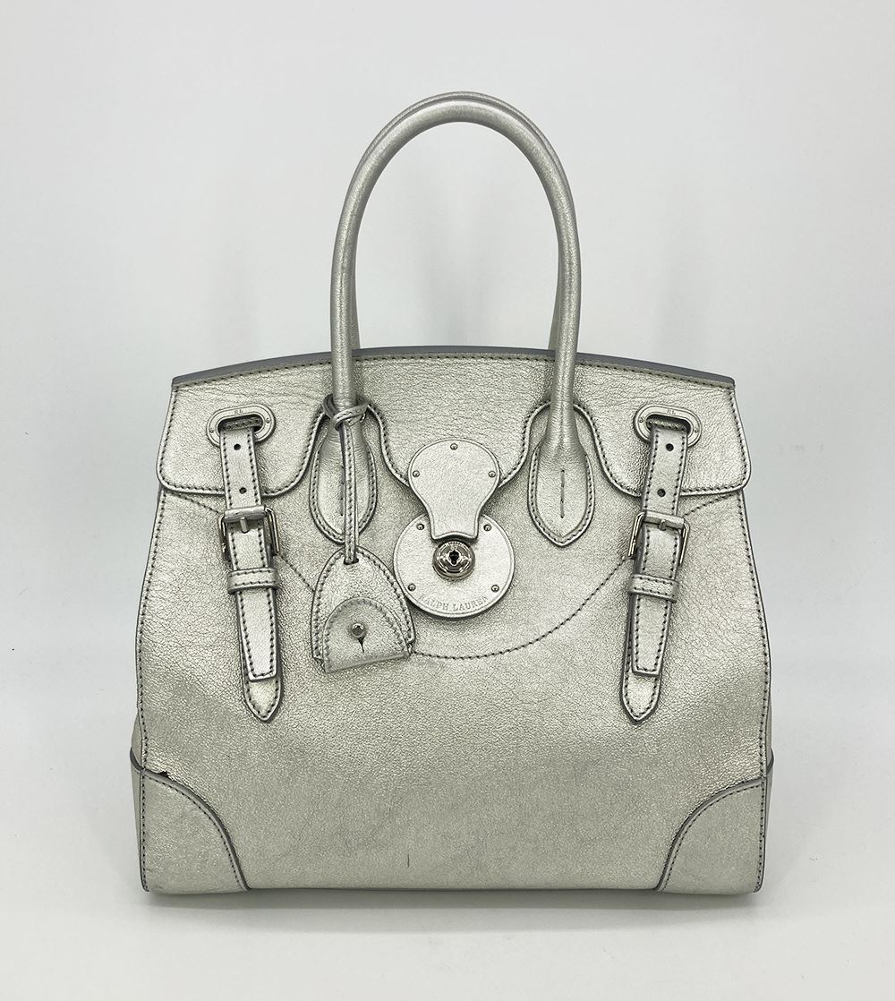 Ralph Lauren Silver Leather Rickey Bag in good condition. Silver leather exterior trimmed with silver hardware. Front sliding latch and double buckle closure opens to a black leather interior with one slit side pocket. overall good condition. a few small scuffs and chips in silver color around exterior- see photos. measurements: 13"x11.75"x7" 4" handle 19-23" strap drop #Bags3012